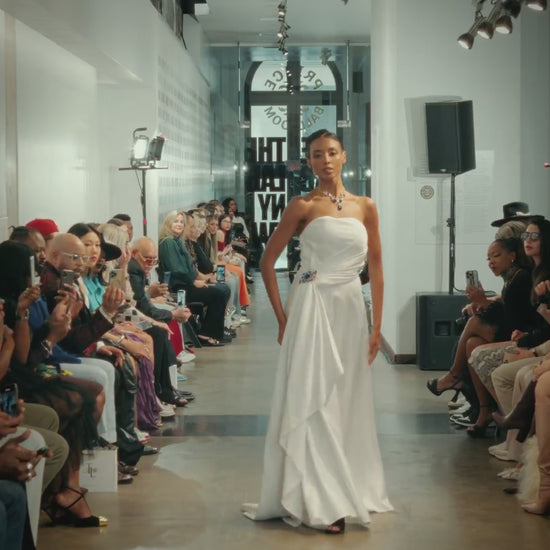 The Celeste Draped Satin Gown is a vision of timeless elegance, crafted from luminous satin that exudes refinement and luxury. This strapless masterpiece features an asymmetrical draped bodice that cinches at the waist, sculpting a silhouette that is both modern and sophisticated. The cascading floor-length skirt flows effortlessly, while the structured side drape detail, adorned with a jeweled embellishment, adds a regal touch of opulence. The smooth satin fabric enhances the gown’s fluidity, ensuring that every movement is as graceful as it is captivating.