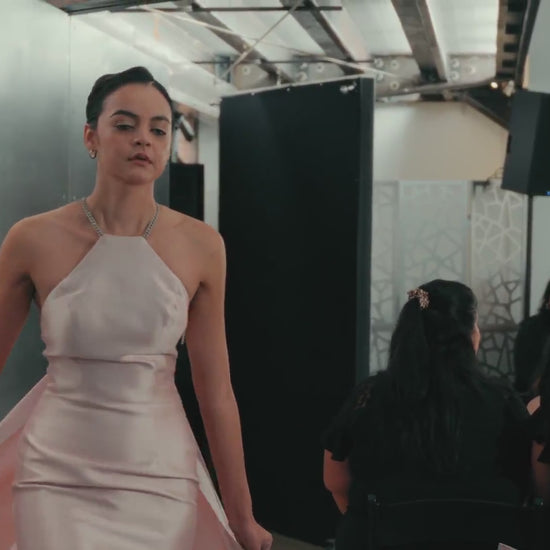 The Ethereal Blush Satin Gown is a unapologetically refined celebration of contemporary femininity. This gown, crafted from sumptuous silk satin, hugs the body in a sculpted silhouette and drapes the figure with ease before cascading into a sweeping, dramatic train.
